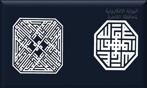 على اليمين كتابة كوفية هندسية تكررت فيها عبارة هو الله أربع مرات داخل مضلع ثماني الشكل، وعلى اليسار كتابة يا محمد تكررت 16 مرة لتعطي شكلاً هندسياً مربعاً