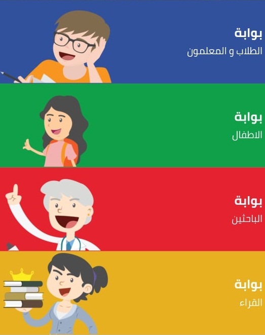 1. يتضمن الموقع أربعة بوابات رئيسية عليك الإختيار من بينهم وهم" بوابة الأطفال، بوابة الطلاب والمعلمون ، بوابة الباحثين، بوابة القراء".